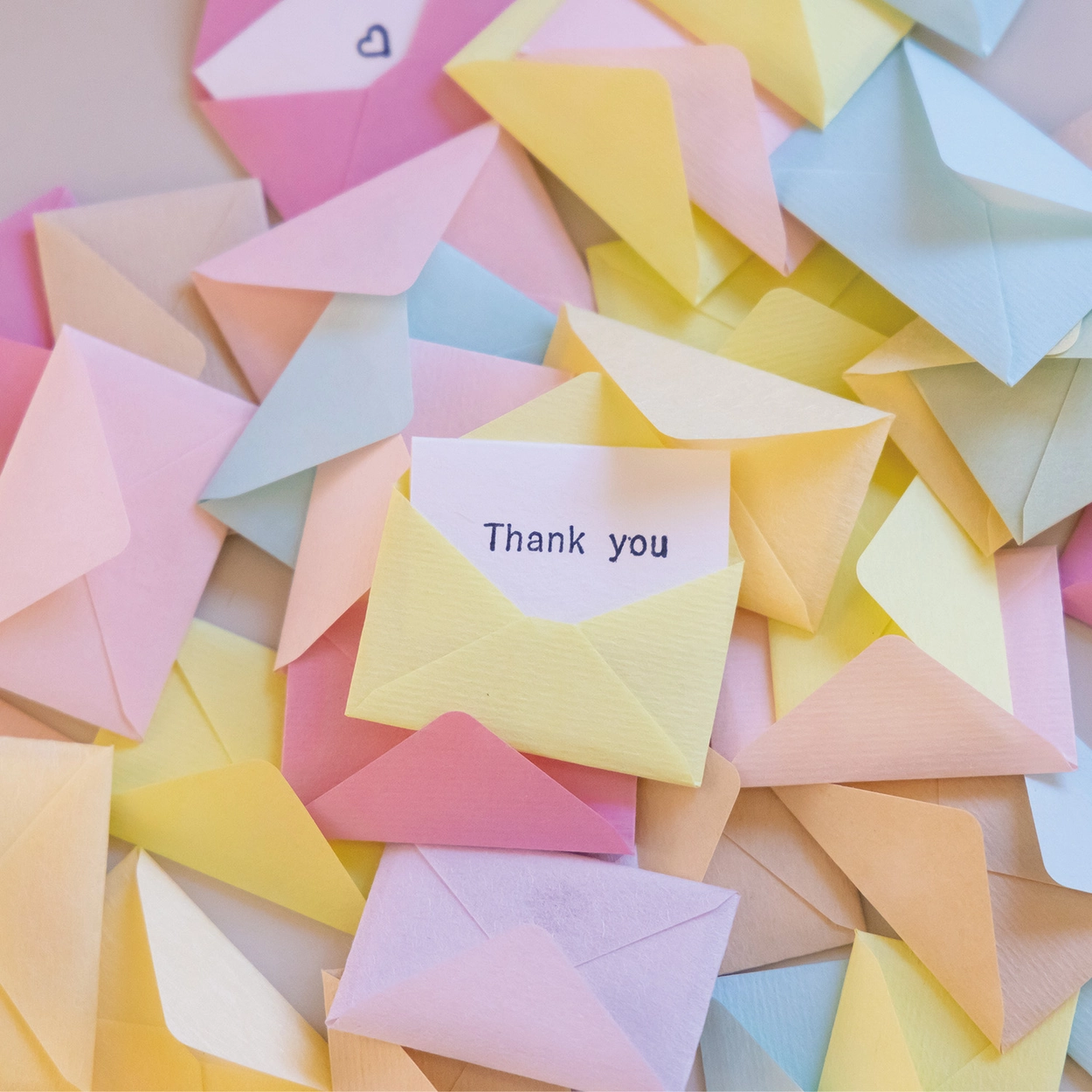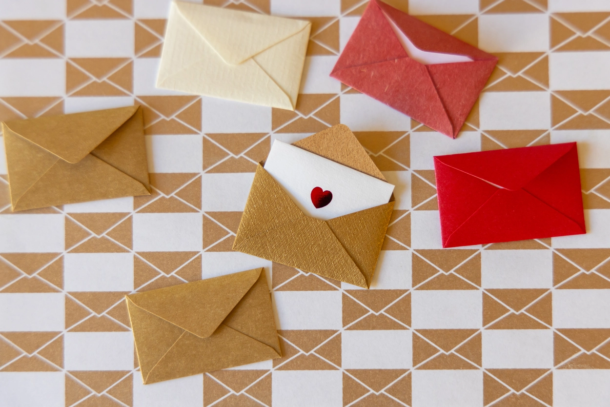 다양한 색상과 질감의 종이로 만든 아주 작은 봉투와 카드 세트