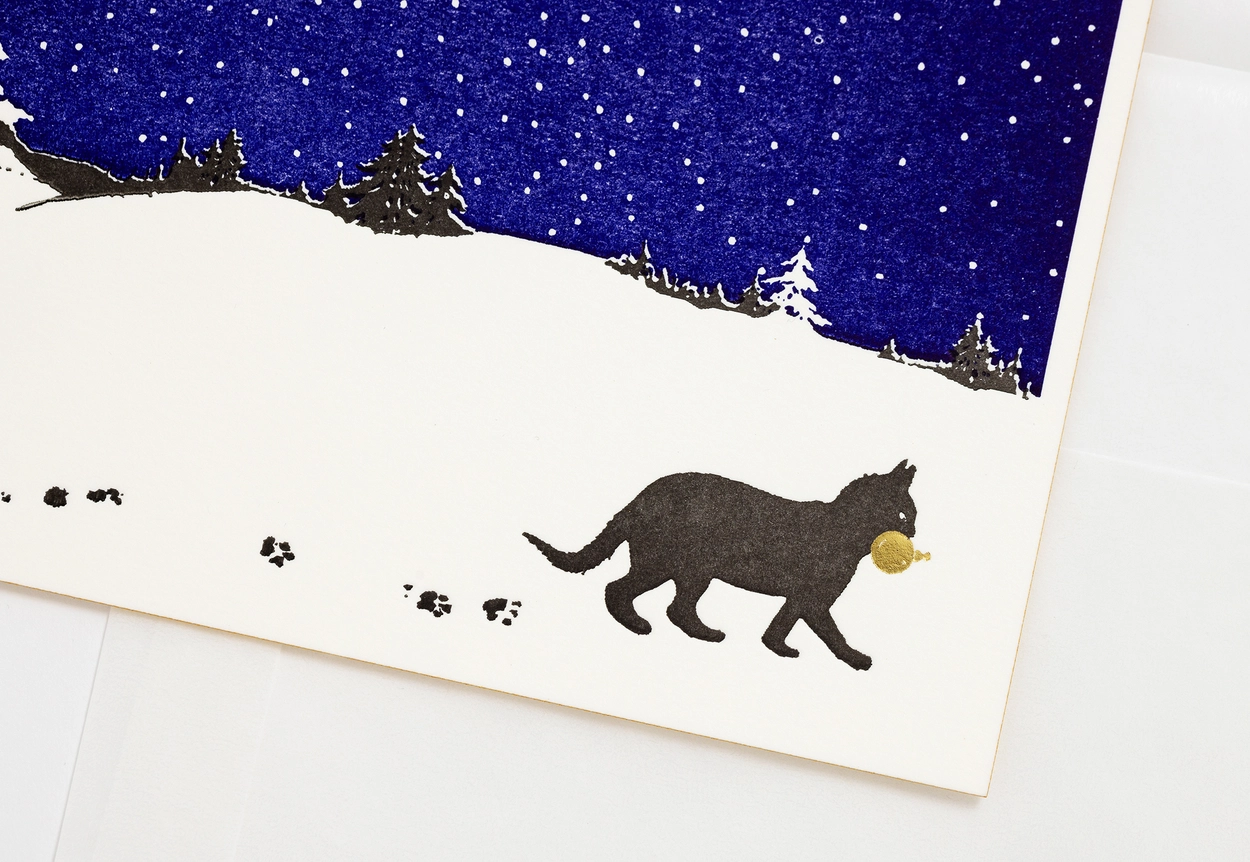 눈이 내리는 밤, 고양이는 숲속 트리에서 얻는 방울을 물고 걸어갑니다