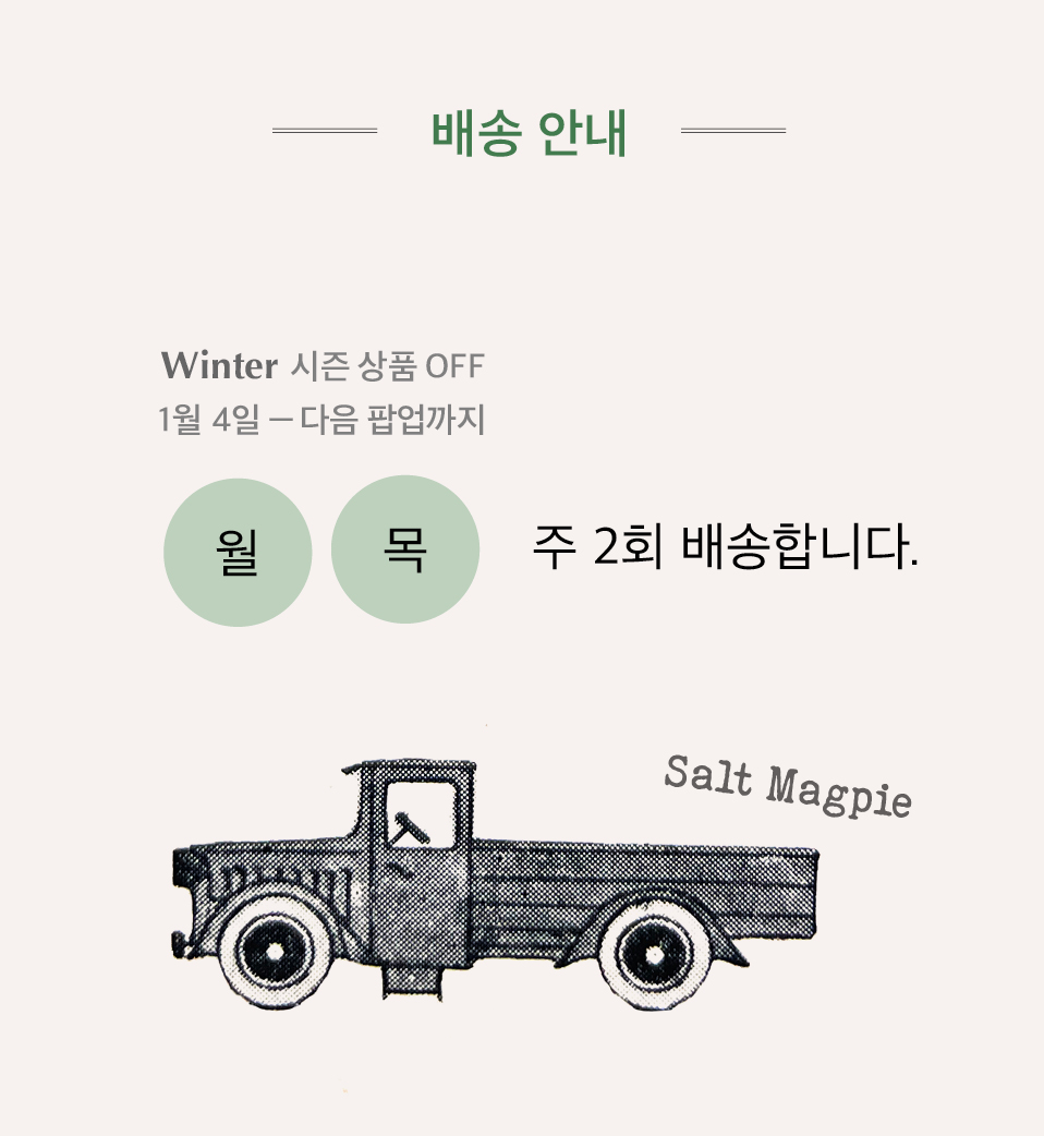 소금까치 saltmagpie | 대표자: 강소이 총괄: 곽지현 서울시 양천구 목동중앙북로 121, 1층 102호 782-34-00825 hello.saltmagpie@gmail.com 2021-고양일산서-1478 신한 110-539-929104(소금까치) Tel. 010-8898-2904 개인정보관리자 강소이 Hosting by (주)아임웹 이용약관 개인정보처리방침 ⓒ saltmagpie All Rights Reserved.