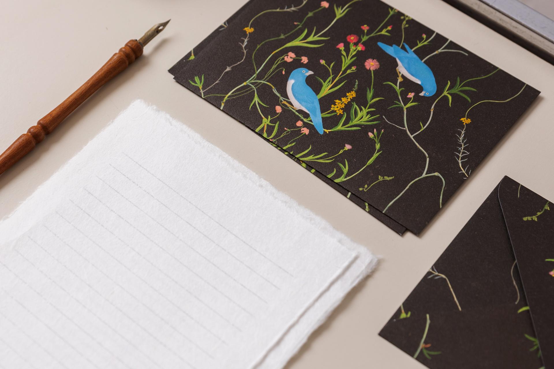 오래된 이미지 속에서 꽃과 식물, 새들이 편지 봉투 위에 다시 고운 색으로 펼쳐집니다.